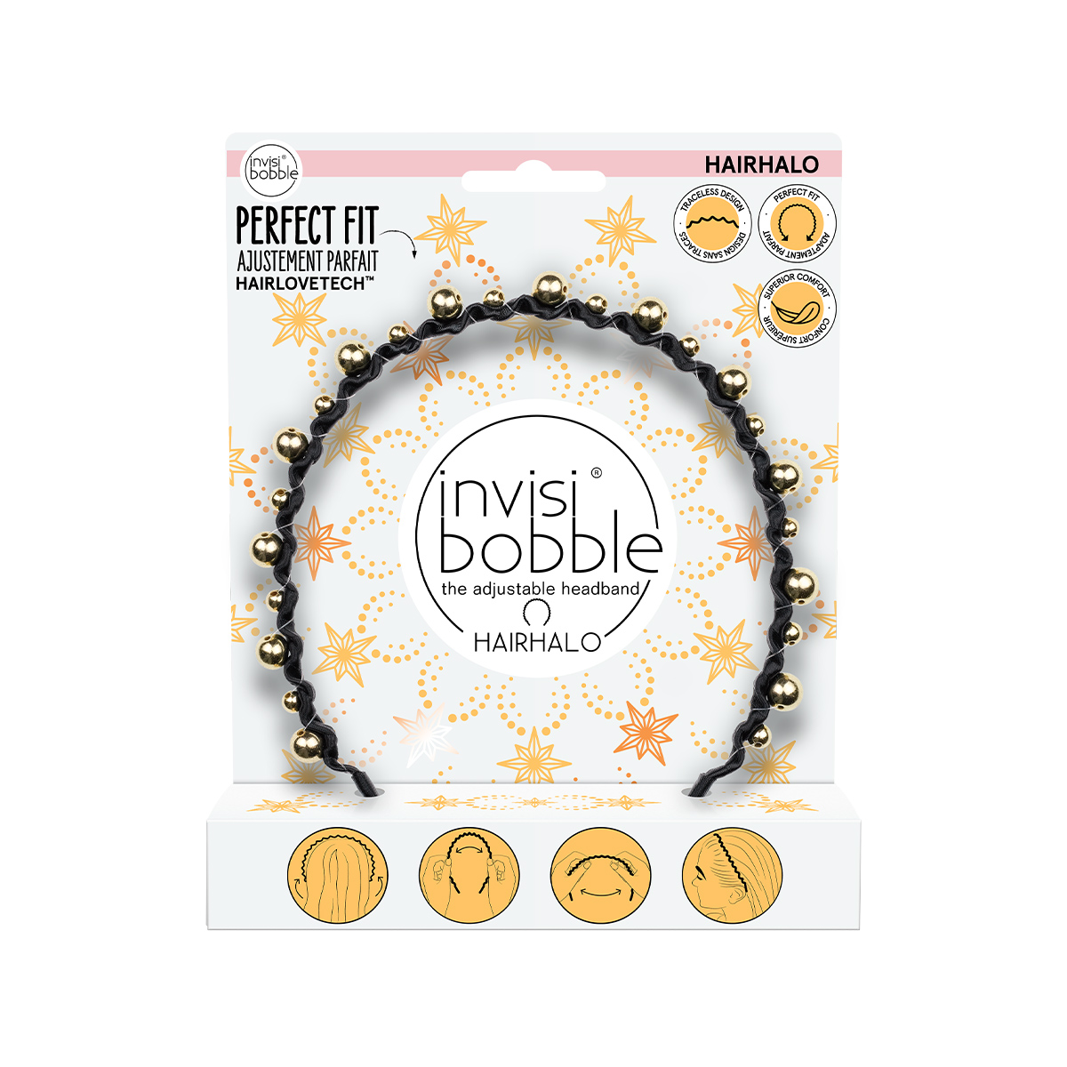 Ободок invisibobble HAIRHALO Time to Shine You're a Star – изящный аксессуар и стильное украшение любой прически. Ободок, украшенный золотистыми бусинами, станет акцентом вечернего образа. Уникальность invisibobble HAIRHALO – в пластичной конструкции, которая адаптируется к форме головы и надежно фиксирует волосы, не оставляя заломов. Изогнутая форма обеспечивает равномерное распределение давления HAIRHALO, благодаря чему ободок не вызывает дискомфорт. Для любых образов, для всех типов волос.